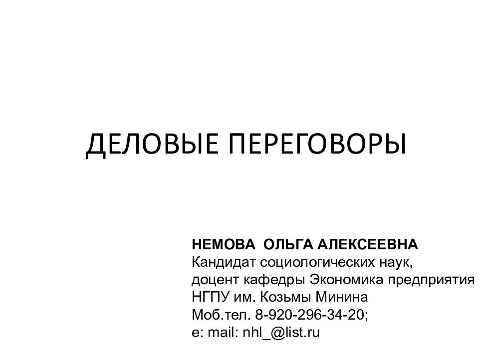 НЕМОВА ОЛЬГА АЛЕКСЕЕВНА Кандидат социологических наук, доцент кафедры Экономика предприятия НГПУ им. Козьмы Минина Моб.тел. 8-920-296-34-20; e: mail: nhl_@list.ru