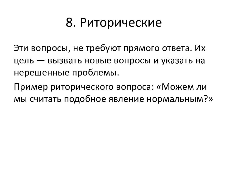 Эти вопросы, не требуют прямого ответа. Их цель — вызвать новые вопросы и указать на нерешенные проблемы. Пример риторического вопроса: «Можем ли мы считать подобное явление нормальным?»