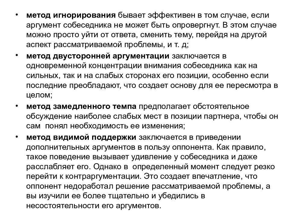 метод игнорирования бывает эффективен в том случае, если аргумент собеседника не может быть опровергнут. В этом случае можно просто уйти от ответа, сменить тему, перейдя на другой аспект рассматриваемой проблемы, и т. д; метод двусторонней аргументации заключается в одновременной концентрации внимания собеседника как на сильных, так и на слабых сторонах его позиции, особенно если последние преобладают, что создает основу для ее пересмотра в целом; метод замедленного темпа предполагает обстоятельное обсуждение наиболее слабых мест в позиции партнера, чтобы он сам понял необходимость ее изменения; метод видимой поддержки заключается в приведении дополнительных аргументов в пользу оппонента. Как правило, такое поведение вызывает удивление у собеседника и даже расслабляет его. Однако в определенный момент следует резко перейти к контраргументации. Это создает впечатление, что оппонент недоработал решение рассматриваемой проблемы, а вы изучили ее более тщательно и убедились в несостоятельности его аргументов.