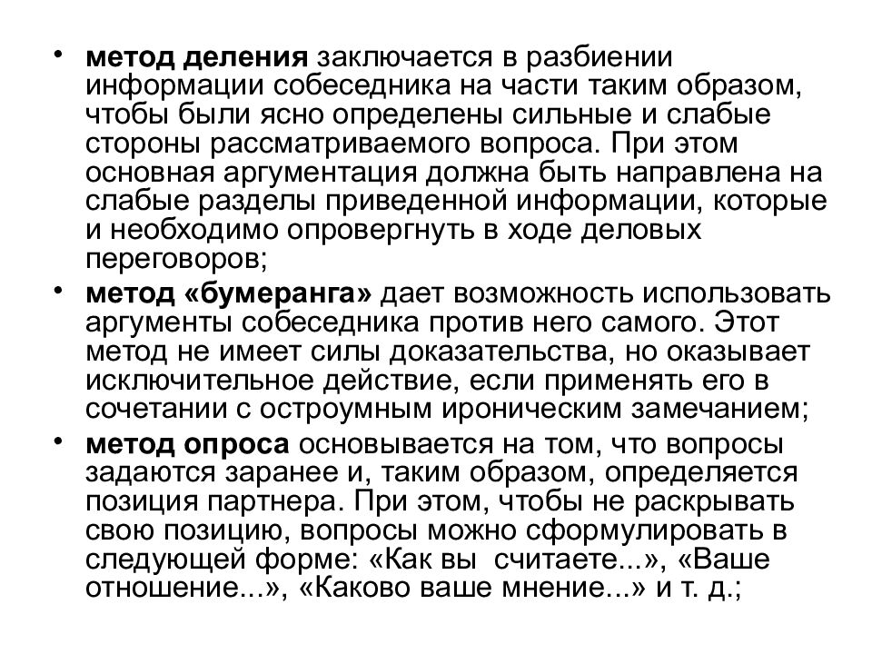 метод деления заключается в разбиении информации собеседника на части таким образом, чтобы были ясно определены сильные и слабые стороны рассматриваемого вопроса. При этом основная аргументация должна быть направлена на слабые разделы приведенной информации, которые и необходимо опровергнуть в ходе деловых переговоров; метод «бумеранга» дает возможность использовать аргументы собеседника против него самого. Этот метод не имеет силы доказательства, но оказывает исключительное действие, если применять его в сочетании с остроумным ироническим замечанием; метод опроса основывается на том, что вопросы задаются заранее и, таким образом, определяется позиция партнера. При этом, чтобы не раскрывать свою позицию, вопросы можно сформулировать в следующей форме: «Как вы считаете...», «Ваше отношение...», «Каково ваше мнение...» и т. д.;