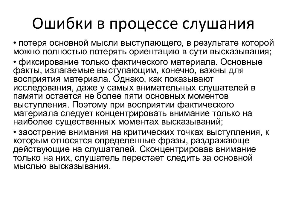• потеря основной мысли выступающего, в результате которой можно полностью потерять ориентацию в сути высказывания; • фиксирование только фактического материала. Основные факты, излагаемые выступающим, конечно, важны для восприятия материала. Однако, как показывают исследования, даже у самых внимательных слушателей в памяти остается не более пяти основных моментов выступления. Поэтому при восприятии фактического материала следует концентрировать внимание только на наиболее существенных моментах высказываний; • заострение внимания на критических точках выступления, к которым относятся определенные фразы, раздражающе действующие на слушателей. Сконцентрировав внимание только на них, слушатель перестает следить за основной мыслью высказывания.