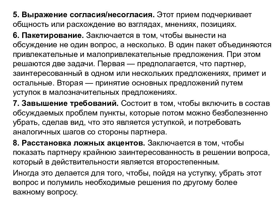 5. Выражение согласия/несогласия. Этот прием подчеркивает общность или расхождение во взглядах, мнениях, позициях. 6. Пакетирование. Заключается в том, чтобы вынести на обсуждение не один вопрос, а несколько. В один пакет объединяются привлекательные и малопривлекательные предложения. При этом решаются две задачи. Первая — предполагается, что партнер, заинтересованный в одном или нескольких предложениях, примет и остальные. Вторая — принятие основных предложений путем уступок в малозначительных предложениях. 7. Завышение требований. Состоит в том, чтобы включить в состав обсуждаемых проблем пункты, которые потом можно безболезненно убрать, сделав вид, что это является уступкой, и потребовать аналогичных шагов со стороны партнера. 8. Расстановка ложных акцентов. Заключается в том, чтобы показать партнеру крайнюю заинтересованность в решении вопроса, который в действительности является второстепенным. Иногда это делается для того, чтобы, пойдя на уступку, убрать этот вопрос и полумиль необходимые решения по другому более важному вопросу.