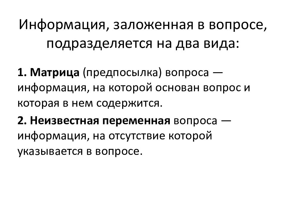 1. Матрица (предпосылка) вопроса — информация, на которой основан вопрос и которая в нем содержится. 2. Неизвестная переменная вопроса — информация, на отсутствие которой указывается в вопросе.