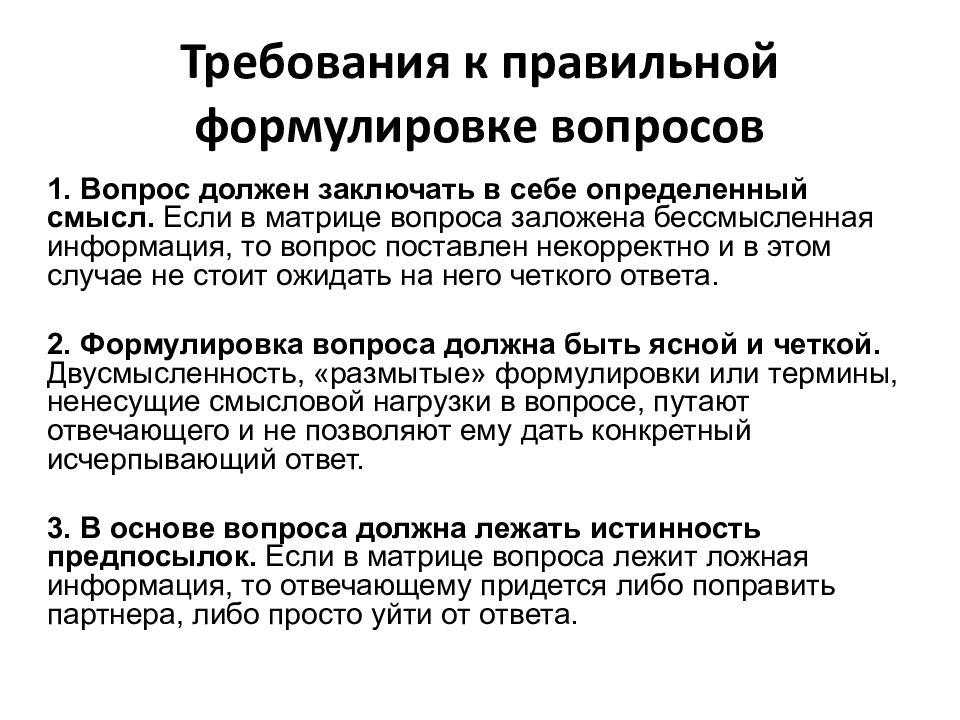 1. Вопрос должен заключать в себе определенный смысл. Если в матрице вопроса заложена бессмысленная информация, то вопрос поставлен некорректно и в этом случае не стоит ожидать на него четкого ответа. 2. Формулировка вопроса должна быть ясной и четкой. Двусмысленность, «размытые» формулировки или термины, ненесущие смысловой нагрузки в вопросе, путают отвечающего и не позволяют ему дать конкретный исчерпывающий ответ. 3. В основе вопроса должна лежать истинность предпосылок. Если в матрице вопроса лежит ложная информация, то отвечающему придется либо поправить партнера, либо просто уйти от ответа.