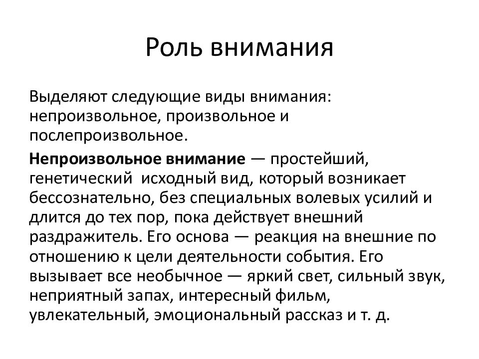 Выделяют следующие виды внимания: непроизвольное, произвольное и послепроизвольное. Непроизвольное внимание — простейший, генетический исходный вид, который возникает бессознательно, без специальных волевых усилий и длится до тех пор, пока действует внешний раздражитель. Его основа — реакция на внешние по отношению к цели деятельности события. Его вызывает все необычное — яркий свет, сильный звук, неприятный запах, интересный фильм, увлекательный, эмоциональный рассказ и т. д.