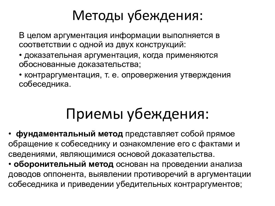 В целом аргументация информации выполняется в соответствии с одной из двух конструкций: • доказательная аргументация, когда применяются обоснованные доказательства; • контраргументация, т. е. опровержения утверждения собеседника. Приемы убеждения: • фундаментальный метод представляет собой прямое обращение к собеседнику и ознакомление его с фактами и сведениями, являющимися основой доказательства. • оборонительный метод основан на проведении анализа доводов оппонента, выявлении противоречий в аргументации собеседника и приведении убедительных контраргументов;