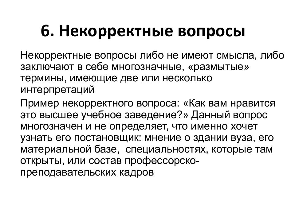 Некорректные вопросы либо не имеют смысла, либо заключают в себе многозначные, «размытые» термины, имеющие две или несколько интерпретаций Пример некорректного вопроса: «Как вам нравится это высшее учебное заведение?» Данный вопрос многозначен и не определяет, что именно хочет узнать его постановщик: мнение о здании вуза, его материальной базе, специальностях, которые там открыты, или состав профессорско- преподавательских кадров