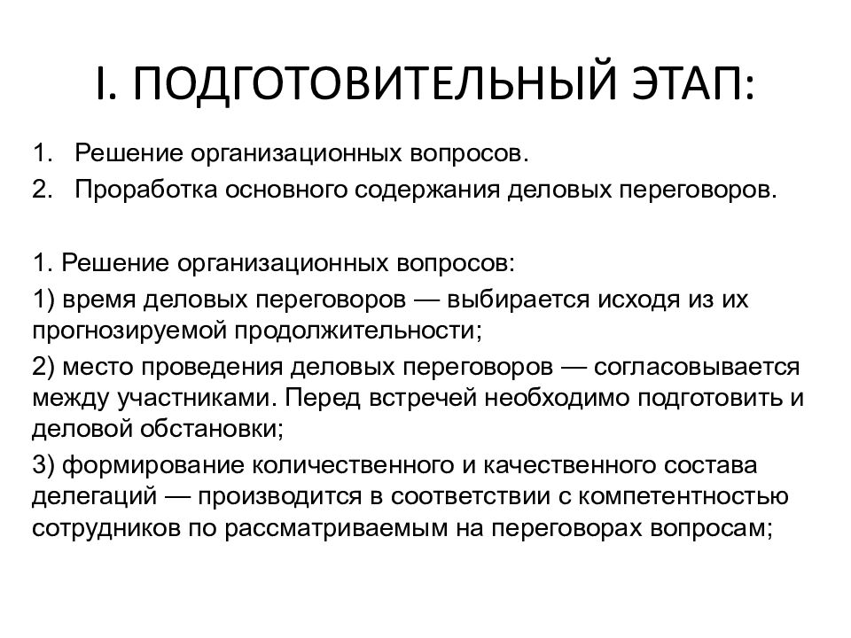 Решение организационных вопросов. Проработка основного содержания деловых переговоров. 1. Решение организационных вопросов: 1) время деловых переговоров — выбирается исходя из их прогнозируемой продолжительности; 2) место проведения деловых переговоров — согласовывается между участниками. Перед встречей необходимо подготовить и деловой обстановки; 3) формирование количественного и качественного состава делегаций — производится в соответствии с компетентностью сотрудников по рассматриваемым на переговорах вопросам;