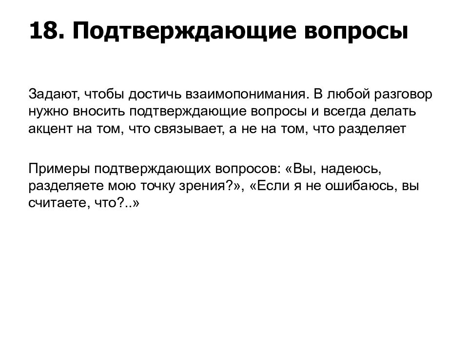 Задают, чтобы достичь взаимопонимания. В любой разговор нужно вносить подтверждающие вопросы и всегда делать акцент на том, что связывает, а не на том, что разделяет Примеры подтверждающих вопросов: «Вы, надеюсь, разделяете мою точку зрения?», «Если я не ошибаюсь, вы считаете, что?..»