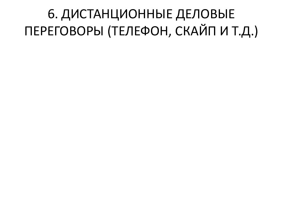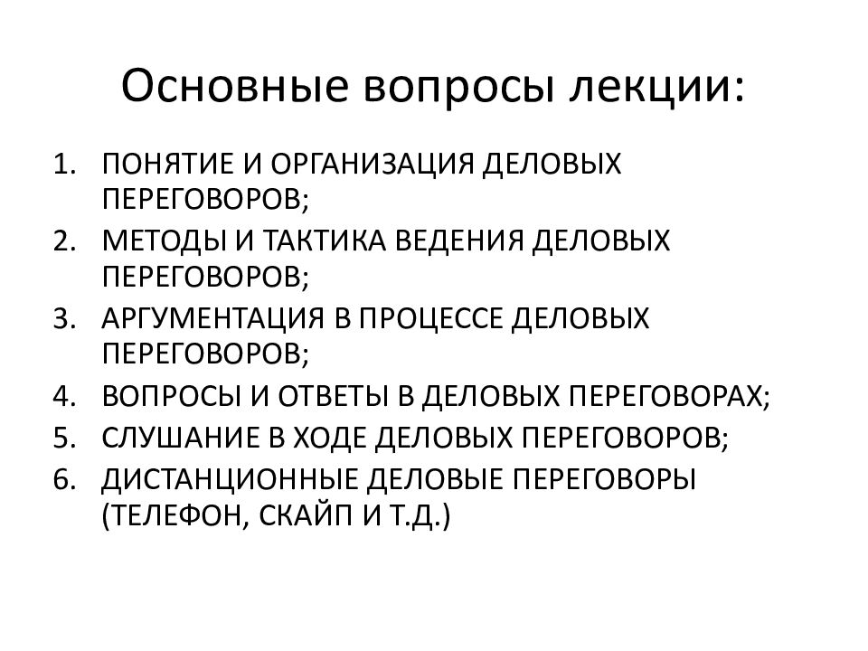 ПОНЯТИЕ И ОРГАНИЗАЦИЯ ДЕЛОВЫХ ПЕРЕГОВОРОВ; МЕТОДЫ И ТАКТИКА ВЕДЕНИЯ ДЕЛОВЫХ ПЕРЕГОВОРОВ; АРГУМЕНТАЦИЯ В ПРОЦЕССЕ ДЕЛОВЫХ ПЕРЕГОВОРОВ; ВОПРОСЫ И ОТВЕТЫ В ДЕЛОВЫХ ПЕРЕГОВОРАХ; СЛУШАНИЕ В ХОДЕ ДЕЛОВЫХ ПЕРЕГОВОРОВ; ДИСТАНЦИОННЫЕ ДЕЛОВЫЕ ПЕРЕГОВОРЫ (ТЕЛЕФОН, СКАЙП И Т.Д.)