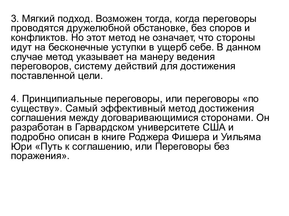3. Мягкий подход. Возможен тогда, когда переговоры проводятся дружелюбной обстановке, без споров и конфликтов. Но этот метод не означает, что стороны идут на бесконечные уступки в ущерб себе. В данном случае метод указывает на манеру ведения переговоров, систему действий для достижения поставленной цели. 4. Принципиальные переговоры, или переговоры «по существу». Самый эффективный метод достижения соглашения между договаривающимися сторонами. Он разработан в Гарвардском университете США и подробно описан в книге Роджера Фишера и Уильяма Юри «Путь к соглашению, или Переговоры без поражения».