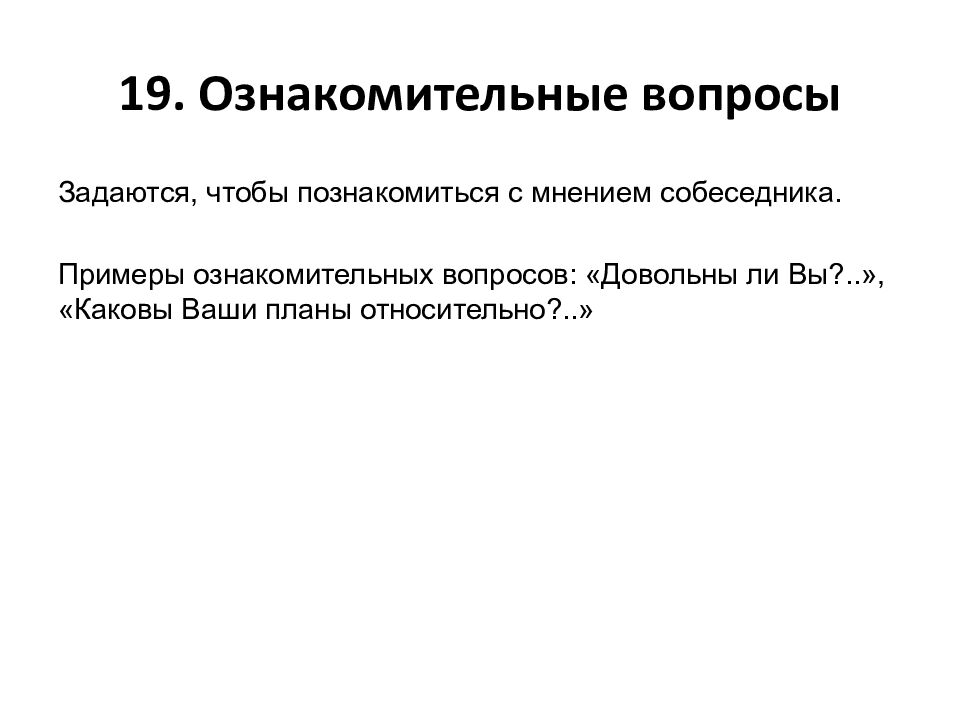 Задаются, чтобы познакомиться с мнением собеседника. Примеры ознакомительных вопросов: «Довольны ли Вы?..», «Каковы Ваши планы относительно?..»