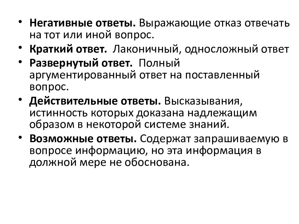 Негативные ответы. Выражающие отказ отвечать на тот или иной вопрос. Краткий ответ. Лаконичный, односложный ответ Развернутый ответ. Полный аргументированный ответ на поставленный вопрос. Действительные ответы. Высказывания, истинность которых доказана надлежащим образом в некоторой системе знаний. Возможные ответы. Содержат запрашиваемую в вопросе информацию, но эта информация в должной мере не обоснована.