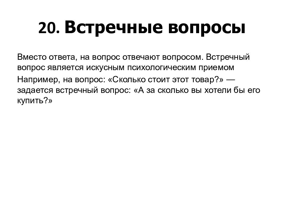 Вместо ответа, на вопрос отвечают вопросом. Встречный вопрос является искусным психологическим приемом Например, на вопрос: «Сколько стоит этот товар?» — задается встречный вопрос: «А за сколько вы хотели бы его купить?»