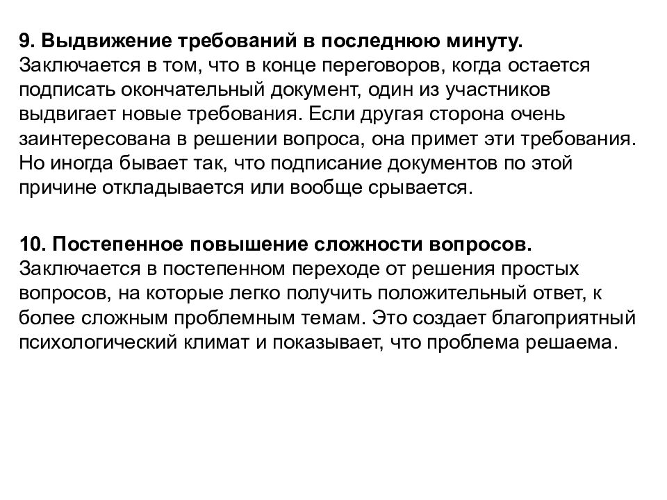 9. Выдвижение требований в последнюю минуту. Заключается в том, что в конце переговоров, когда остается подписать окончательный документ, один из участников выдвигает новые требования. Если другая сторона очень заинтересована в решении вопроса, она примет эти требования. Но иногда бывает так, что подписание документов по этой причине откладывается или вообще срывается. 10. Постепенное повышение сложности вопросов. Заключается в постепенном переходе от решения простых вопросов, на которые легко получить положительный ответ, к более сложным проблемным темам. Это создает благоприятный психологический климат и показывает, что проблема решаема.