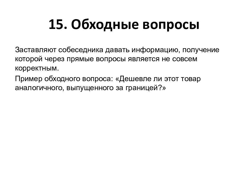 Заставляют собеседника давать информацию, получение которой через прямые вопросы является не совсем корректным. Пример обходного вопроса: «Дешевле ли этот товар аналогичного, выпущенного за границей?»