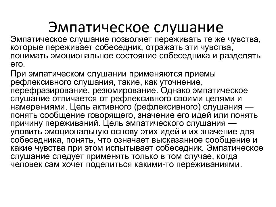 Эмпатическое слушание позволяет переживать те же чувства, которые переживает собеседник, отражать эти чувства, понимать эмоциональное состояние собеседника и разделять его. При эмпатическом слушании применяются приемы рефлексивного слушания, такие, как уточнение, перефразирование, резюмирование. Однако эмпатическое слушание отличается от рефлексивного своими целями и намерениями. Цель активного (рефлексивного) слушания — понять сообщение говорящего, значение его идей или понять причину переживаний. Цель эмпатического слушания — уловить эмоциональную основу этих идей и их значение для собеседника, понять, что означает высказанное сообщение и какие чувства при этом испытывает собеседник. Эмпатическое слушание следует применять только в том случае, когда человек сам хочет поделиться какими-то переживаниями.