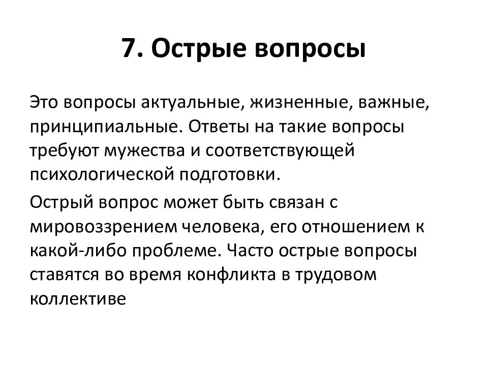 Это вопросы актуальные, жизненные, важные, принципиальные. Ответы на такие вопросы требуют мужества и соответствующей психологической подготовки. Острый вопрос может быть связан с мировоззрением человека, его отношением к какой-либо проблеме. Часто острые вопросы ставятся во время конфликта в трудовом коллективе