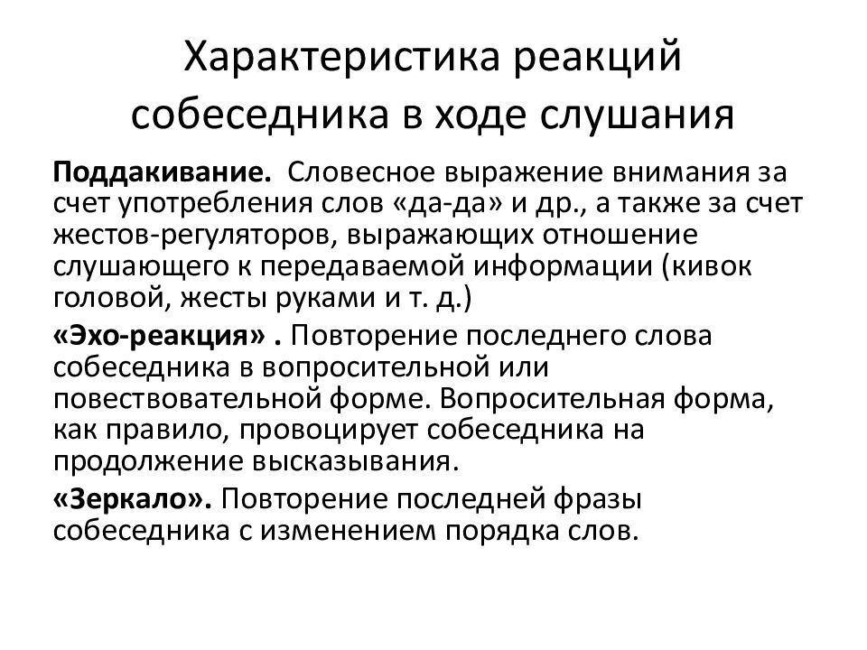 Поддакивание. Словесное выражение внимания за счет употребления слов «да-да» и др., а также за счет жестов-регуляторов, выражающих отношение слушающего к передаваемой информации (кивок головой, жесты руками и т. д.) «Эхо-реакция». Повторение последнего слова собеседника в вопросительной или повествовательной форме. Вопросительная форма, как правило, провоцирует собеседника на продолжение высказывания. «Зеркало». Повторение последней фразы собеседника с изменением порядка слов.