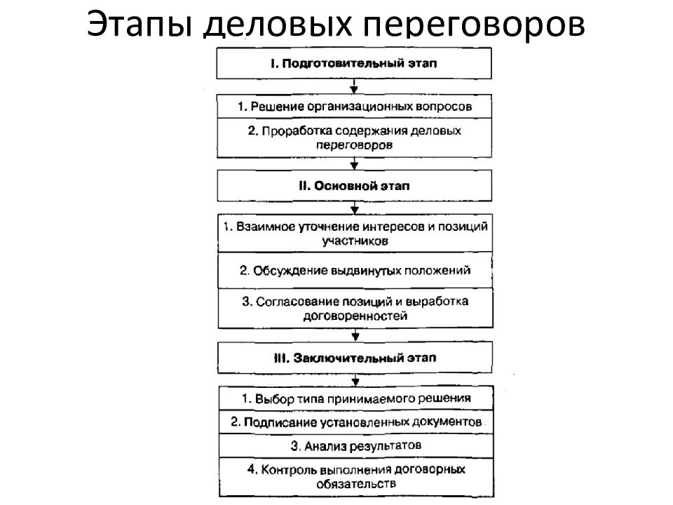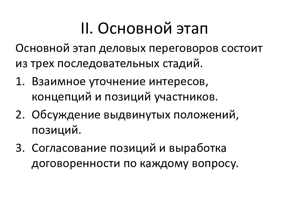 Основной этап деловых переговоров состоит из трех последовательных стадий. Взаимное уточнение интересов, концепций и позиций участников. Обсуждение выдвинутых положений, позиций. Согласование позиций и выработка договоренности по каждому вопросу.