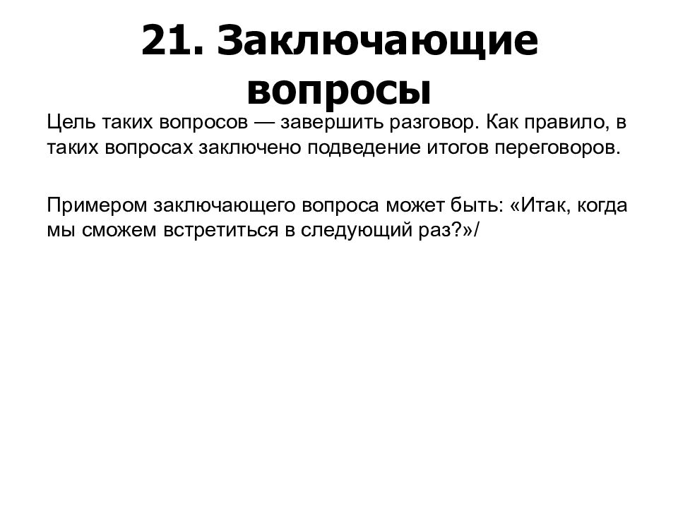 Цель таких вопросов — завершить разговор. Как правило, в таких вопросах заключено подведение итогов переговоров. Примером заключающего вопроса может быть: «Итак, когда мы сможем встретиться в следующий раз?»/