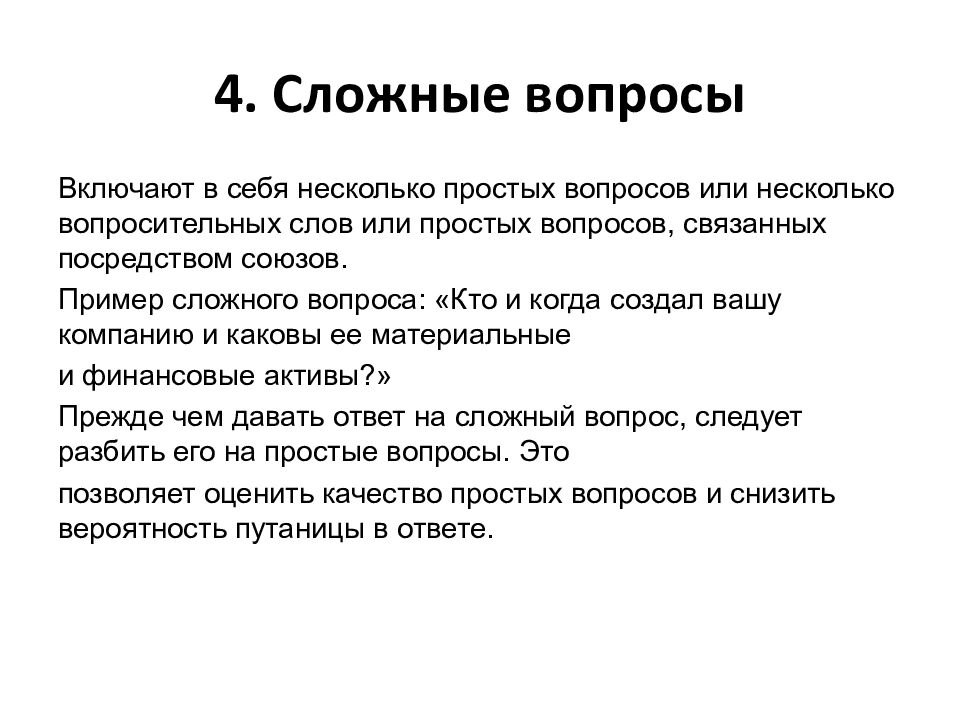 Включают в себя несколько простых вопросов или несколько вопросительных слов или простых вопросов, связанных посредством союзов. Пример сложного вопроса: «Кто и когда создал вашу компанию и каковы ее материальные и финансовые активы?» Прежде чем давать ответ на сложный вопрос, следует разбить его на простые вопросы. Это позволяет оценить качество простых вопросов и снизить вероятность путаницы в ответе.