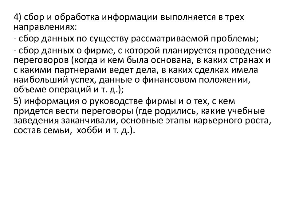4) сбор и обработка информации выполняется в трех направлениях: - сбор данных по существу рассматриваемой проблемы; - сбор данных о фирме, с которой планируется проведение переговоров (когда и кем была основана, в каких странах и с какими партнерами ведет дела, в каких сделках имела наибольший успех, данные о финансовом положении, объеме операций и т. д.); 5) информация о руководстве фирмы и о тех, с кем придется вести переговоры (где родились, какие учебные заведения заканчивали, основные этапы карьерного роста, состав семьи, хобби и т. д.).
