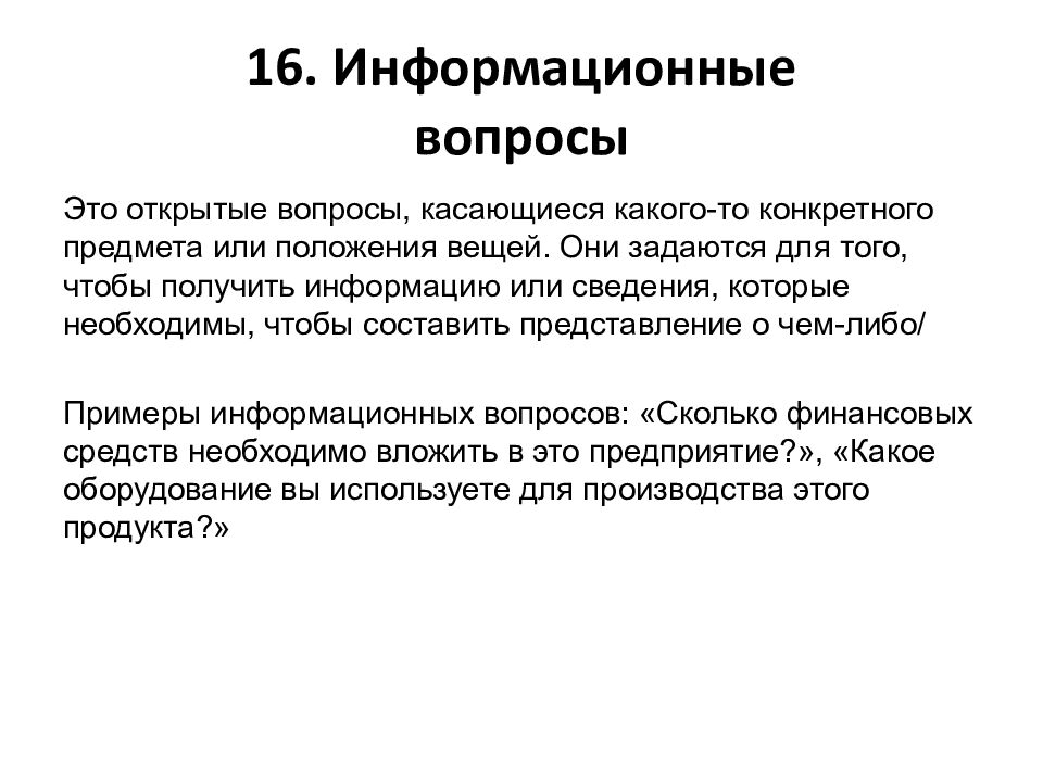 Это открытые вопросы, касающиеся какого-то конкретного предмета или положения вещей. Они задаются для того, чтобы получить информацию или сведения, которые необходимы, чтобы составить представление о чем-либо/ Примеры информационных вопросов: «Сколько финансовых средств необходимо вложить в это предприятие?», «Какое оборудование вы используете для производства этого продукта?»