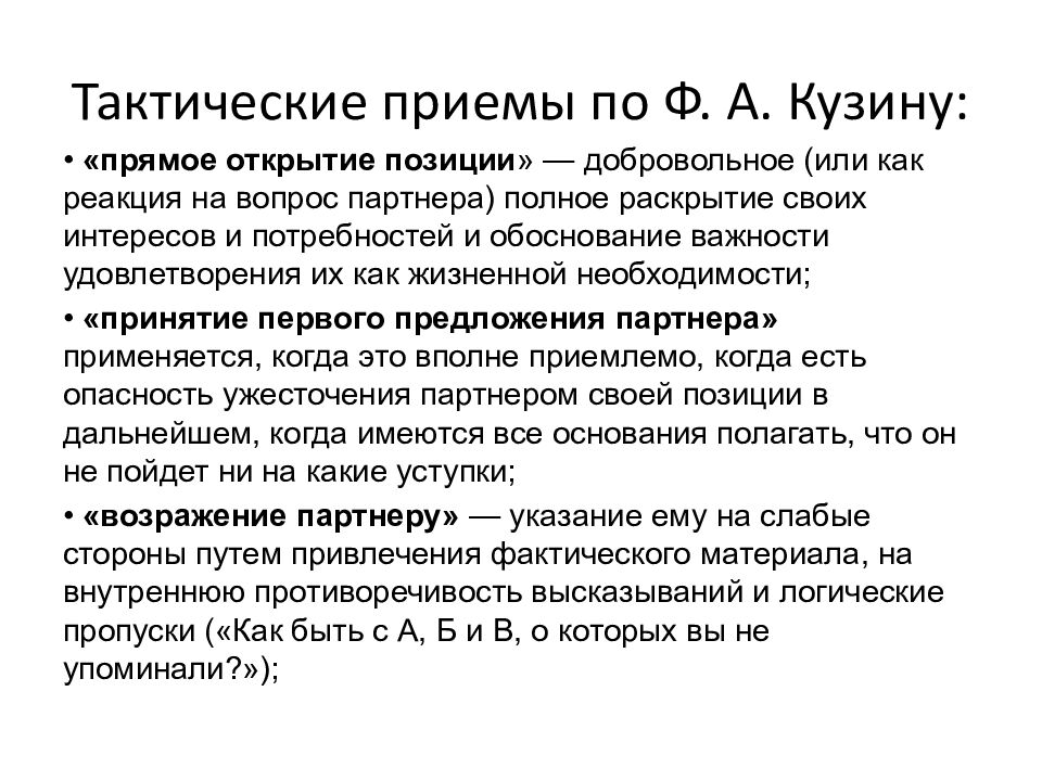 • «прямое открытие позиции » — добровольное (или как реакция на вопрос партнера) полное раскрытие своих интересов и потребностей и обоснование важности удовлетворения их как жизненной необходимости; • «принятие первого предложения партнера» применяется, когда это вполне приемлемо, когда есть опасность ужесточения партнером своей позиции в дальнейшем, когда имеются все основания полагать, что он не пойдет ни на какие уступки; • «возражение партнеру» — указание ему на слабые стороны путем привлечения фактического материала, на внутреннюю противоречивость высказываний и логические пропуски («Как быть с А, Б и В, о которых вы не упоминали?»);