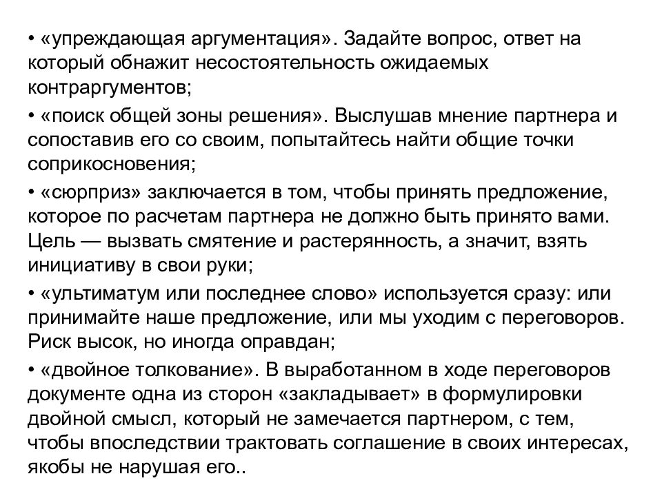 • «упреждающая аргументация». Задайте вопрос, ответ на который обнажит несостоятельность ожидаемых контраргументов; • «поиск общей зоны решения». Выслушав мнение партнера и сопоставив его со своим, попытайтесь найти общие точки соприкосновения; • «сюрприз» заключается в том, чтобы принять предложение, которое по расчетам партнера не должно быть принято вами. Цель — вызвать смятение и растерянность, а значит, взять инициативу в свои руки; • «ультиматум или последнее слово» используется сразу: или принимайте наше предложение, или мы уходим с переговоров. Риск высок, но иногда оправдан; • «двойное толкование». В выработанном в ходе переговоров документе одна из сторон «закладывает» в формулировки двойной смысл, который не замечается партнером, с тем, чтобы впоследствии трактовать соглашение в своих интересах, якобы не нарушая его..