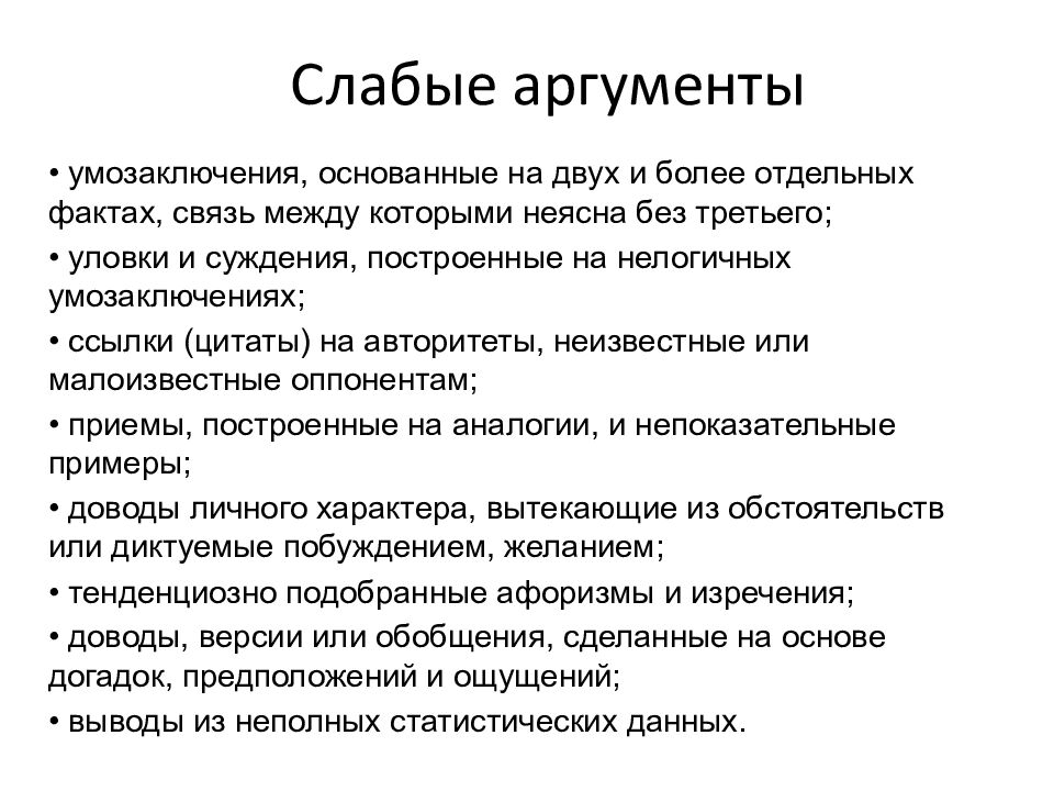 • умозаключения, основанные на двух и более отдельных фактах, связь между которыми неясна без третьего; • уловки и суждения, построенные на нелогичных умозаключениях; • ссылки (цитаты) на авторитеты, неизвестные или малоизвестные оппонентам; • приемы, построенные на аналогии, и непоказательные примеры; • доводы личного характера, вытекающие из обстоятельств или диктуемые побуждением, желанием; • тенденциозно подобранные афоризмы и изречения; • доводы, версии или обобщения, сделанные на основе догадок, предположений и ощущений; • выводы из неполных статистических данных.