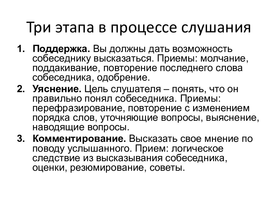 Поддержка. Вы должны дать возможность собеседнику высказаться. Приемы: молчание, поддакивание, повторение последнего слова собеседника, одобрение. Уяснение. Цель слушателя – понять, что он правильно понял собеседника. Приемы: перефразирование, повторение с изменением порядка слов, уточняющие вопросы, выяснение, наводящие вопросы. Комментирование. Высказать свое мнение по поводу услышанного. Прием: логическое следствие из высказывания собеседника, оценки, резюмирование, советы.