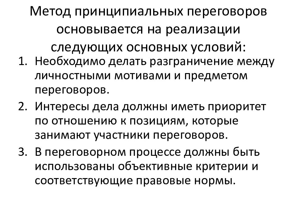Слайд 16: Метод принципиальных переговоров основывается на реализации следующих основных условий:
