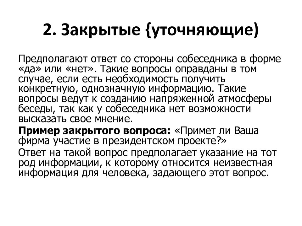 Предполагают ответ со стороны собеседника в форме «да» или «нет». Такие вопросы оправданы в том случае, если есть необходимость получить конкретную, однозначную информацию. Такие вопросы ведут к созданию напряженной атмосферы беседы, так как у собеседника нет возможности высказать свое мнение. Пример закрытого вопроса: «Примет ли Ваша фирма участие в президентском проекте?» Ответ на такой вопрос предполагает указание на тот род информации, к которому относится неизвестная информация для человека, задающего этот вопрос.