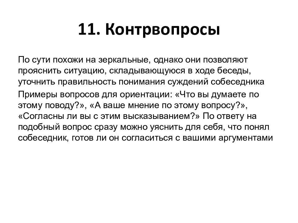 Задаются во время любого разговора, чтобы выяснить, понимает ли вас собеседник. К контрольным вопросам относятся: «Вы согласны с моим тезисом?», «Вы считаете так же, как и я?»
