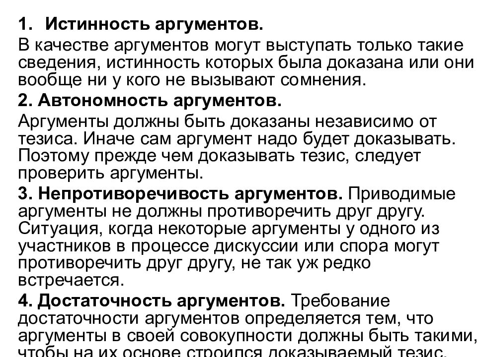 Истинность аргументов. В качестве аргументов могут выступать только такие сведения, истинность которых была доказана или они вообще ни у кого не вызывают сомнения. 2. Автономность аргументов. Аргументы должны быть доказаны независимо от тезиса. Иначе сам аргумент надо будет доказывать. Поэтому прежде чем доказывать тезис, следует проверить аргументы. 3. Непротиворечивость аргументов. Приводимые аргументы не должны противоречить друг другу. Ситуация, когда некоторые аргументы у одного из участников в процессе дискуссии или спора могут противоречить друг другу, не так уж редко встречается. 4. Достаточность аргументов. Требование достаточности аргументов определяется тем, что аргументы в своей совокупности должны быть такими, чтобы на их основе строился доказываемый тезис.