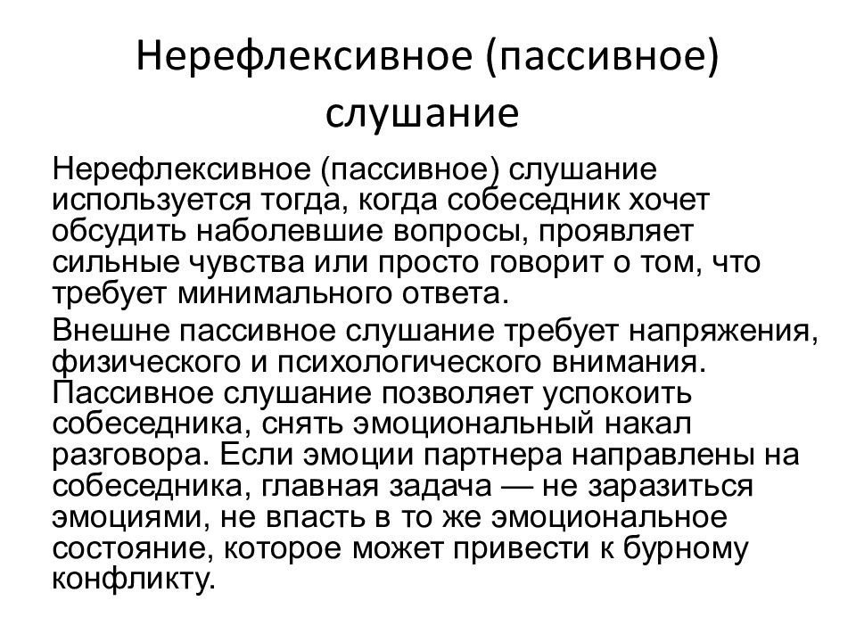 Нерефлексивное (пассивное) слушание используется тогда, когда собеседник хочет обсудить наболевшие вопросы, проявляет сильные чувства или просто говорит о том, что требует минимального ответа. Внешне пассивное слушание требует напряжения, физического и психологического внимания. Пассивное слушание позволяет успокоить собеседника, снять эмоциональный накал разговора. Если эмоции партнера направлены на собеседника, главная задача — не заразиться эмоциями, не впасть в то же эмоциональное состояние, которое может привести к бурному конфликту.