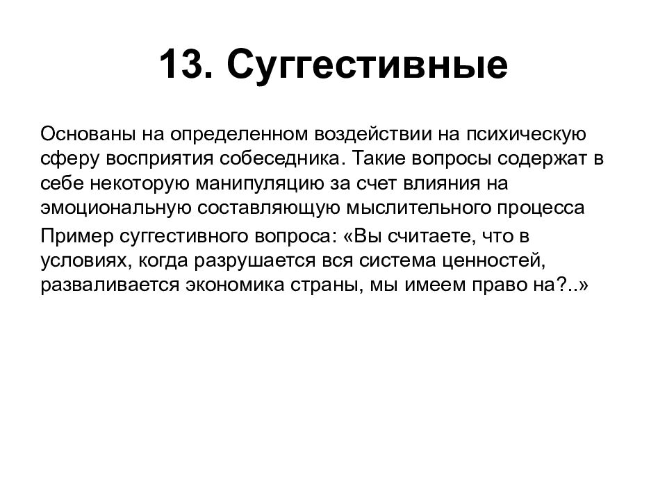 Основаны на определенном воздействии на психическую сферу восприятия собеседника. Такие вопросы содержат в себе некоторую манипуляцию за счет влияния на эмоциональную составляющую мыслительного процесса Пример суггестивного вопроса: «Вы считаете, что в условиях, когда разрушается вся система ценностей, разваливается экономика страны, мы имеем право на?..»