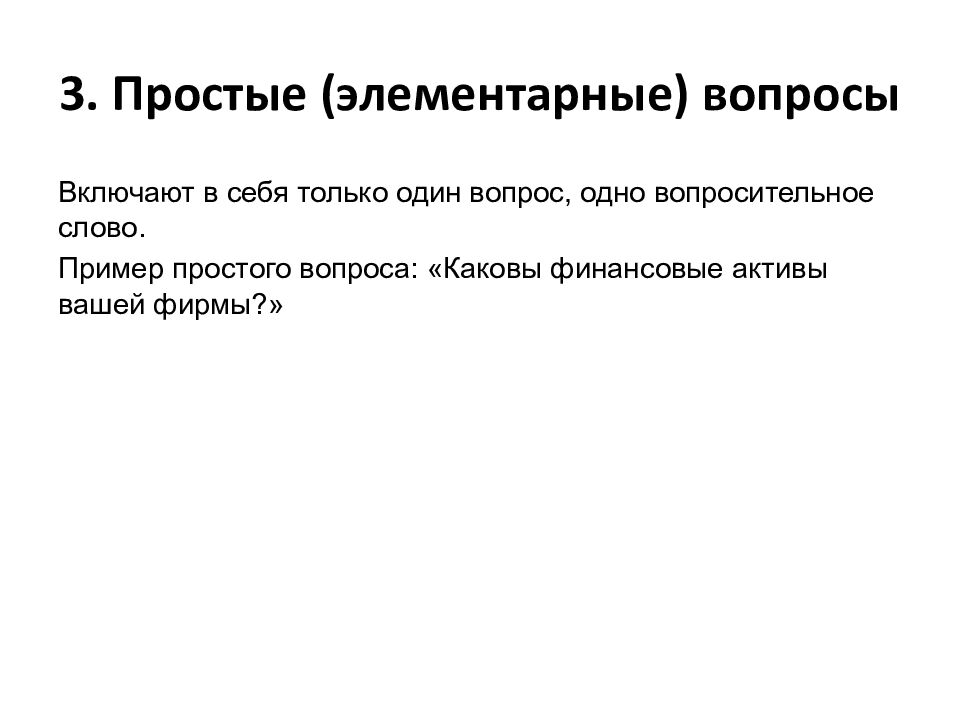 Включают в себя только один вопрос, одно вопросительное слово. Пример простого вопроса: «Каковы финансовые активы вашей фирмы?»