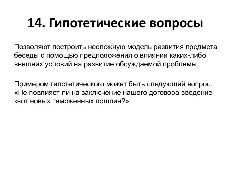 Позволяют построить несложную модель развития предмета беседы с помощью предположения о влиянии каких-либо внешних условий на развитие обсуждаемой проблемы. Примером гипотетического может быть следующий вопрос: «Не повлияет ли на заключение нашего договора введение квот новых таможенных пошлин?»