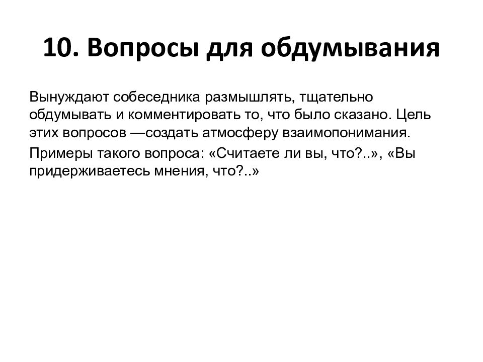 Вынуждают собеседника размышлять, тщательно обдумывать и комментировать то, что было сказано. Цель этих вопросов —создать атмосферу взаимопонимания. Примеры такого вопроса: «Считаете ли вы, что?..», «Вы придерживаетесь мнения, что?..»