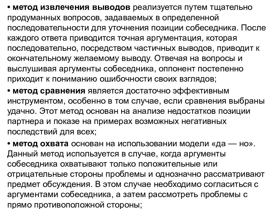 • метод извлечения выводов реализуется путем тщательно продуманных вопросов, задаваемых в определенной последовательности для уточнения позиции собеседника. После каждого ответа приводится точная аргументация, которая последовательно, посредством частичных выводов, приводит к окончательному желаемому выводу. Отвечая на вопросы и выслушивая аргументы собеседника, оппонент постепенно приходит к пониманию ошибочности своих взглядов; • метод сравнения является достаточно эффективным инструментом, особенно в том случае, если сравнения выбраны удачно. Этот метод основан на анализе недостатков позиции партнера и показе на примерах возможных негативных последствий для всех; • метод охвата основан на использовании модели «да — но». Данный метод используется в случае, когда аргументы собеседника охватывают только положительные или отрицательные стороны проблемы и однозначно рассматривают предмет обсуждения. В этом случае необходимо согласиться с аргументами собеседника, а затем рассмотреть проблемы с прямо противоположной стороны;