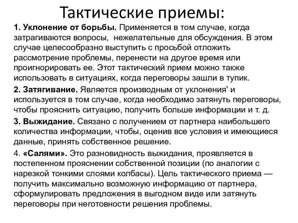 1. Уклонение от борьбы. Применяется в том случае, когда затрагиваются вопросы, нежелательные для обсуждения. В этом случае целесообразно выступить с просьбой отложить рассмотрение проблемы, перенести на другое время или проигнорировать ее. Этот тактический прием можно также использовать в ситуациях, когда переговоры зашли в тупик. 2. Затягивание. Является производным от уклонения' и используется в том случае, когда необходимо затянуть переговоры, чтобы прояснить ситуацию, получить больше информации и т. д. 3. Выжидание. Связано с получением от партнера наибольшего количества информации, чтобы, оценив все условия и имеющиеся данные, принять собственное решение. 4. «Салями». Это разновидность выжидания, проявляется в постепенном прояснении собственной позиции (по аналогии с нарезкой тонкими слоями колбасы). Цель тактического приема — получить максимально возможную информацию от партнера, сформулировать предложения в выгодном виде или затянуть переговоры при неготовности решения проблемы.