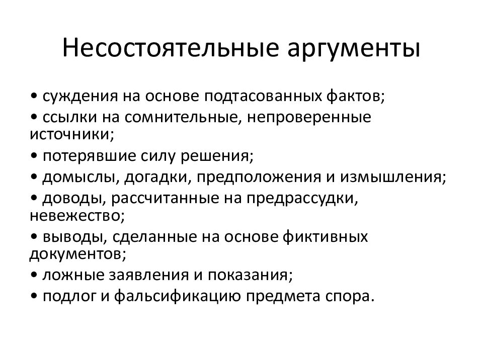 • суждения на основе подтасованных фактов; • ссылки на сомнительные, непроверенные источники; • потерявшие силу решения; • домыслы, догадки, предположения и измышления; • доводы, рассчитанные на предрассудки, невежество; • выводы, сделанные на основе фиктивных документов; • ложные заявления и показания; • подлог и фальсификацию предмета спора.