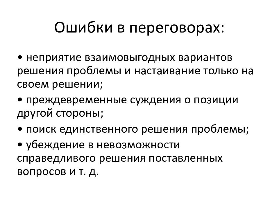 • неприятие взаимовыгодных вариантов решения проблемы и настаивание только на своем решении; • преждевременные суждения о позиции другой стороны; • поиск единственного решения проблемы; • убеждение в невозможности справедливого решения поставленных вопросов и т. д.