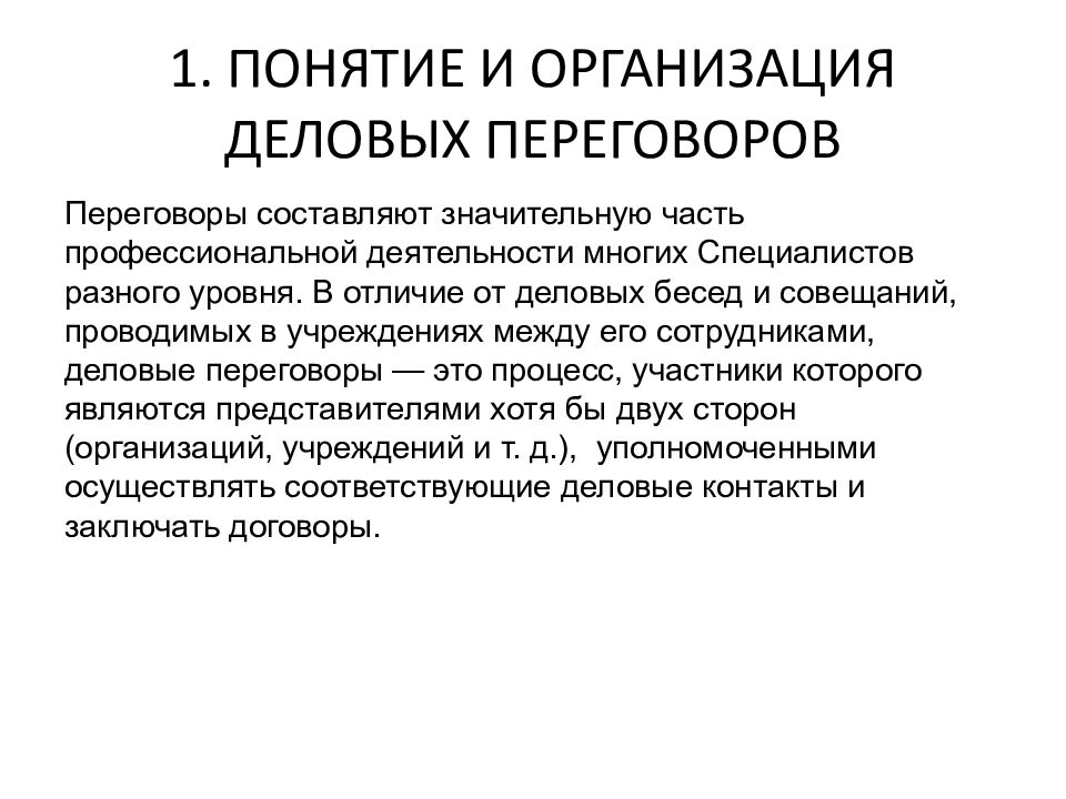 Переговоры составляют значительную часть профессиональной деятельности многих Специалистов разного уровня. В отличие от деловых бесед и совещаний, проводимых в учреждениях между его сотрудниками, деловые переговоры — это процесс, участники которого являются представителями хотя бы двух сторон (организаций, учреждений и т. д.), уполномоченными осуществлять соответствующие деловые контакты и заключать договоры.