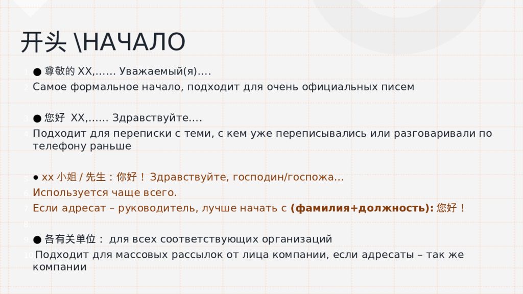 ● 尊敬的 XX,…… Уважаемый (я)…. Самое формальное начало, подходит для очень официальных писем ● 您好 XX, …… Здравствуйте …. Подходит для переписки с теми, с кем уже переписывались или разговаривали по телефону раньше ● xx 小姐 / 先生:你好! Здравствуйте, господин / госпожа … Используется чаще всего. Если адресат – руководитель, лучше начать с ( фамилия+должность ): 您好! ● 各有关单位: для всех соответствующих организаций Подходит для массовых рассылок от лица компании, если адресаты – так же компании