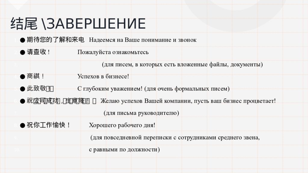 ● 期待您的了解和来电 Надеемся на Ваше понимание и звонок ● 请查收 ! Пожалуйста ознакомьтесь (для писем, в которых есть вложенные файлы, документы) ● 商祺! Успехов в бизнесе! ● 此致敬礼! С глубоким уважением! (для очень формальных писем) ● 祝贵公司成功,生意兴隆! Желаю успехов Вашей компании, пусть ваш бизнес процветает! (для письма руководителю) ● 祝你工作愉快! Хорошего рабочего дня! (для повседневной переписки с сотрудниками среднего звена, с равными по должности)