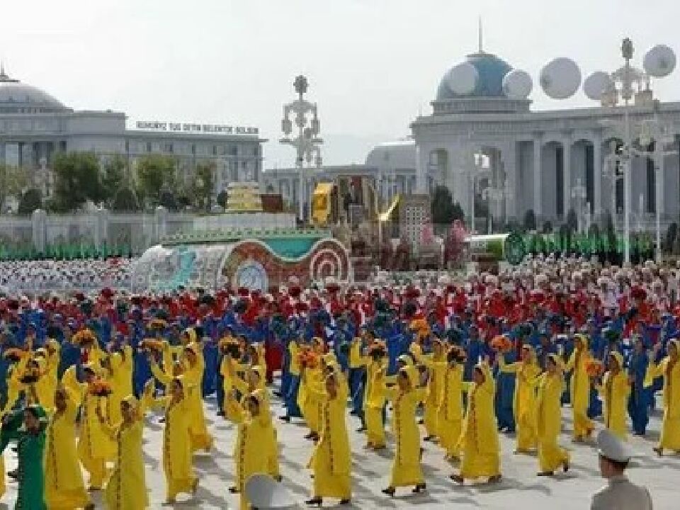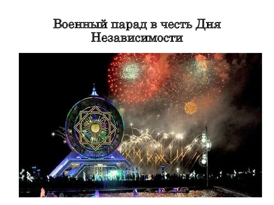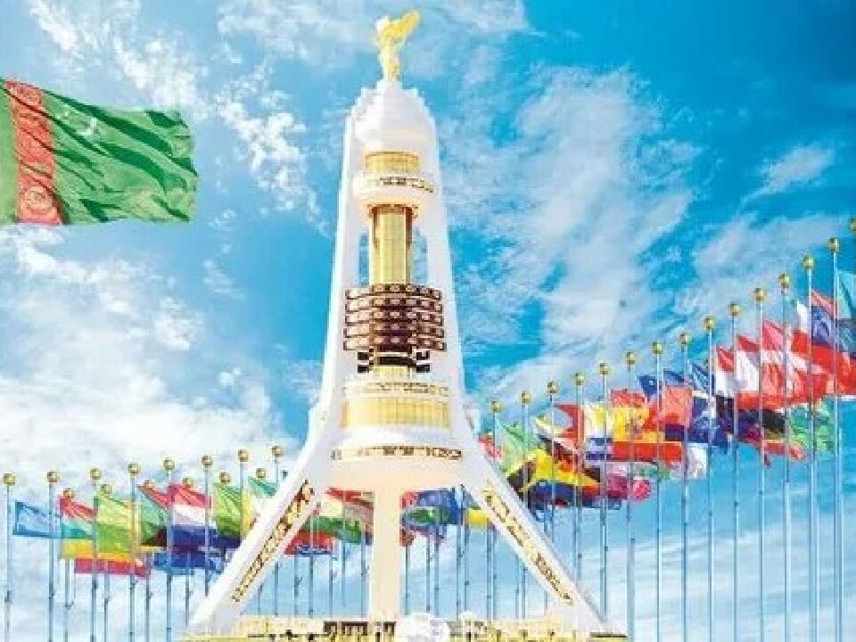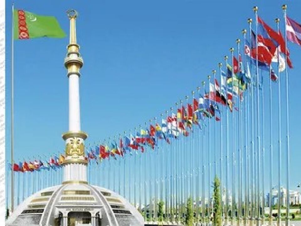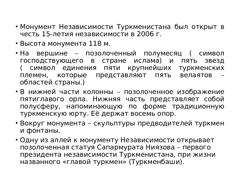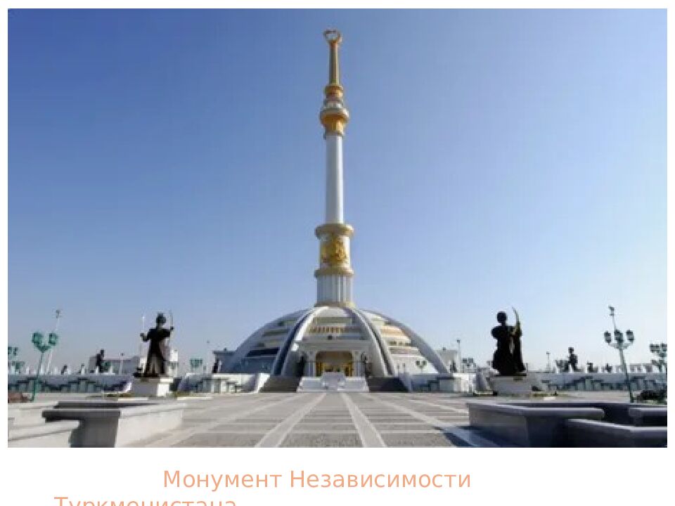 Монумент Независимости Туркменистана был открыт в честь 15-летия независимости в 2006 г. Высота монумента 118 м. На вершине – позолоченный полумесяц ( символ господствующего в стране ислама) и пять звезд ( символ единения пяти крупнейших туркменских племен, которые представляют пять велаятов – областей страны.) В нижней части колонны – позолоченное изображение пятиглавого орла. Нижняя часть представляет собой полусферу, напоминающую по форме традиционную туркменскую юрту. Её держат восемь опор. Вокруг монумента – скульптуры предводителей туркмен и фонтаны. Одну из аллей к монументу Независимости открывает позолоченная статуя Сапармурата Ниязова – первого президента независимости Туркменистана, при жизни названного «главой туркмен» (Туркменбаши).