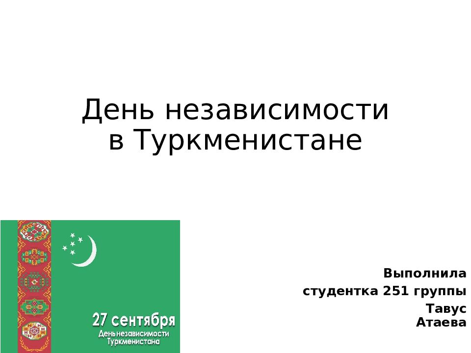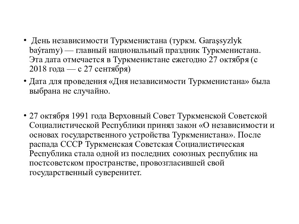 День независимости Туркменистана (туркм. Garaşsyzlyk baýramy ) — главный национальный праздник Туркменистана. Эта дата отмечается в Туркменистане ежегодно 27 октября (с 2018 года — с 27 сентября) Дата для проведения «Дня независимости Туркменистана» была выбрана не случайно. 27 октября 1991 года Верховный Cовет Туркменской Советской Социалистической Республики принял закон «О независимости и основах государственного устройства Туркменистана». После распада СССР Туркменская Советская Социалистическая Республика стала одной из последних cоюзных республик на постсоветском пространстве, провозгласившей свой государственный суверенитет.